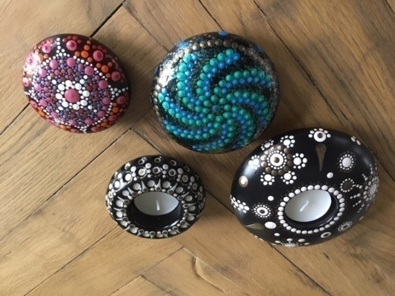 In deze workshop ga je fijn aan de slag met verf, dot pennen en voorbeelden en kies je zelf de kleuren. Na ongeveer 2,5 uur ga je in ieder geval met een mooi werkstukje naar huis. Maak je keuze: Steen 8 cm voor € 22,00 Waxinelichtje 9 cm voor € 27,00. Waxinelichtje 13 cm voor € 34,50